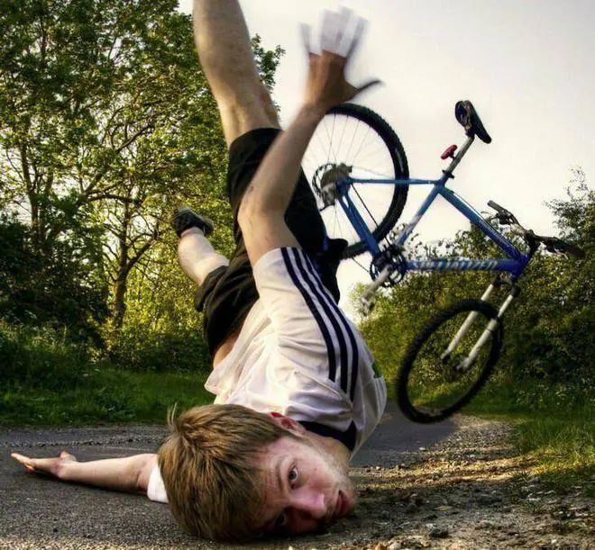 2.骑自行车摔倒的瞬间,用脸刹车太疼了。