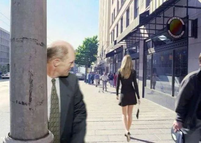 24.一位大叔回头看美女的瞬间,全然不知自己下一秒就要撞到电线杆了。