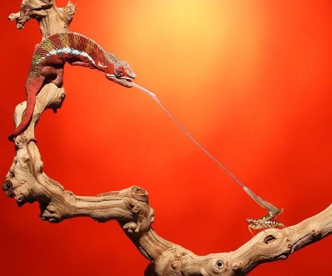 5.变色龙捕食螳螂的瞬间,螳螂还未看到敌人就被吃了。